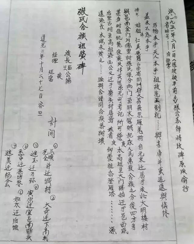 “历物本乎天,人本乎祖!故先王制礼……与享帝并重,追远与慎终,盖未不忘本乎?始祖讳仁美,原籍陕西省同州府大荔县东雁羗村,自元末迁居于永北大门楼村,与邑南金门川德里张氏系分两门,至明末寇贼犯永,人民离散,合族之分徙四方者甚多,时值饥荒,家乘失传,其世系无可考记,所可稽者,庚太高祖至大门楼始迁于邑西底后里古村,至高祖洛西公又迁于磨头村居焉,兹者庚仰蒙祖德,忝登雁塔,……源远流长,本深末茂之……验与,谨同合族恭树坟。”